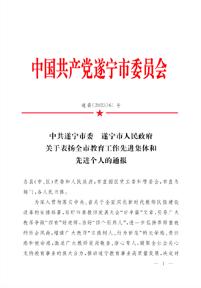 柯? 蔚 榮獲“遂寧市優(yōu)秀教師及教練員優(yōu)荷獎” 遂寧市第四中學(xué)校 榮獲“遂寧市教育工作先進(jìn)集體”