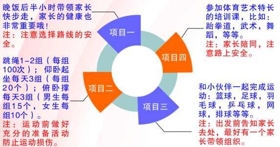 ? ? ??針對目前全國中小學生體質(zhì)健康逐年下降的情況,按照國家教育部對學校體育工作的要求,大力提高中小學生的身體素質(zhì),我校根據(jù)實際情況,要求學生每天必須達到1小時的鍛煉時間。建議學生每日至少完成一個項目,完成后請家長在相應的日期下簽字: