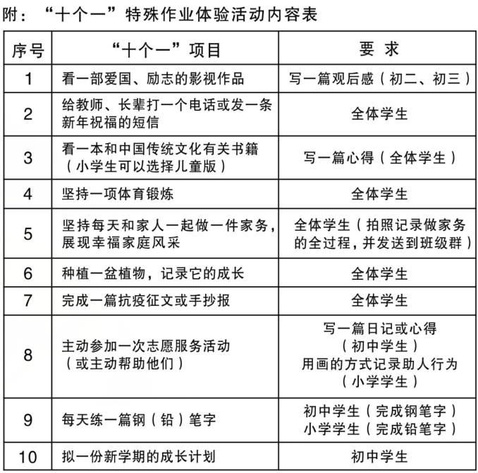 ? ? 您好!感謝你一學期來對學校工作的理解和支持。根據(jù)市教體局通知,學生定于2021年1月25日期末考試后放寒假,下期學生2月28日報到注冊,3月1日正式行課。為了讓您的子女度過一個愉快的假期,請家長與子女一起合理安排假期生活,并請您指導督促子女做好以下工作: