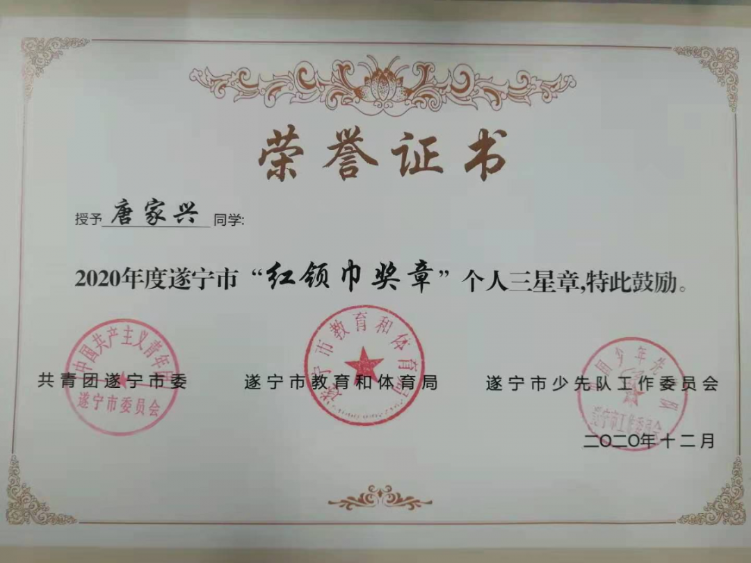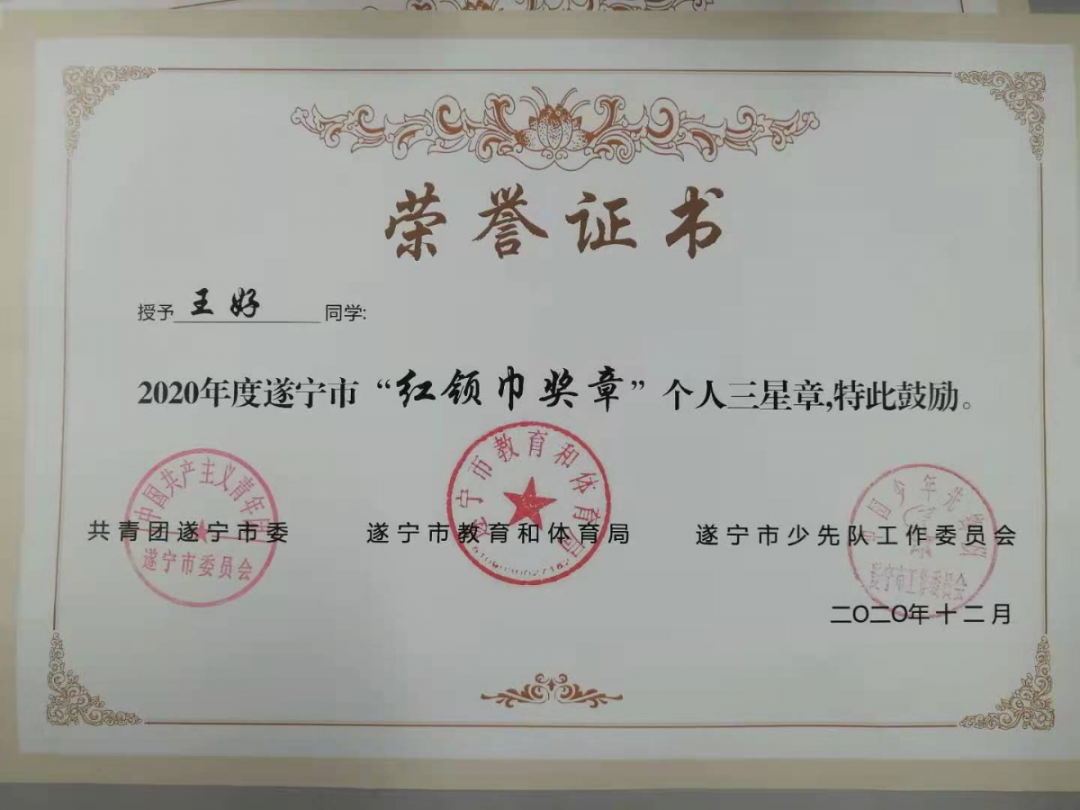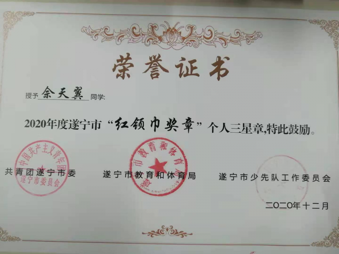 ? ? 為深入學習貫徹習近平總書記對少年兒童和少先隊工作重要指示和第八次全國少代會精神,認真落實三大少先隊制度性文件,不斷創(chuàng)新教育引導的方式方法,引導廣大少先隊員爭做“新時代好隊員”,激勵廣大少先隊輔導員更加熱愛少先隊工作,全市少先隊改革任務全面落實,少先隊組織不斷迸發(fā)出新的生機和活力,涌現(xiàn)出一大批優(yōu)秀集體和個人。經(jīng)逐級推薦、認真審核、網(wǎng)絡公示后,我校以下優(yōu)秀少先隊員榮獲遂寧市“紅領巾獎章”三星章: