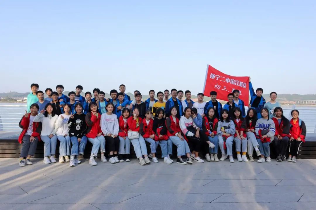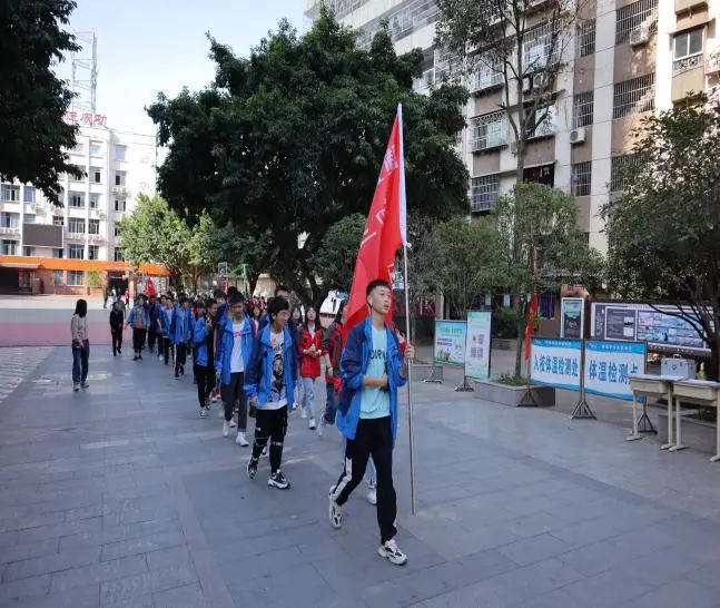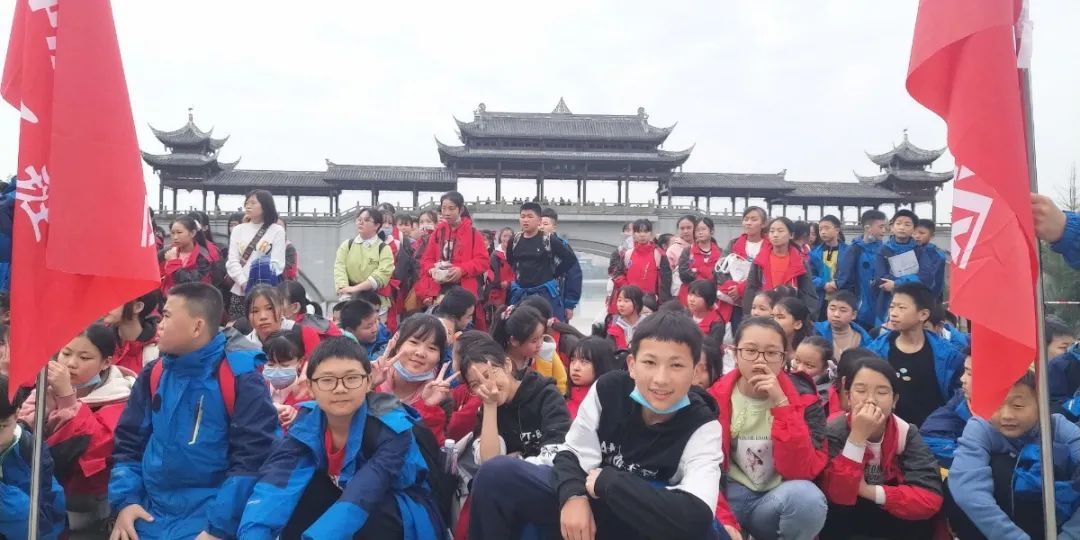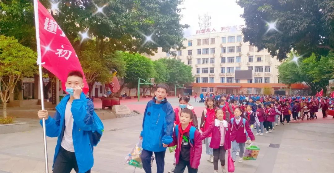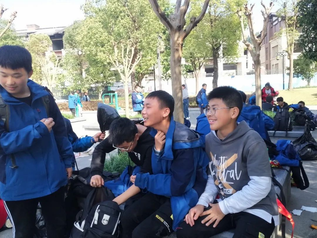 ? ??當天下午,濱江校區(qū)的操場上,艷陽高照、紅旗飄飄、笑臉飛揚,初三的孩子們身著統(tǒng)一的校服,等待著期待已久的“親近自然,挑戰(zhàn)自我”遠足拉練活動。