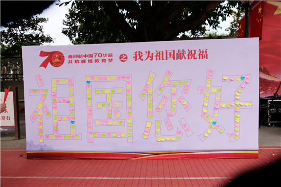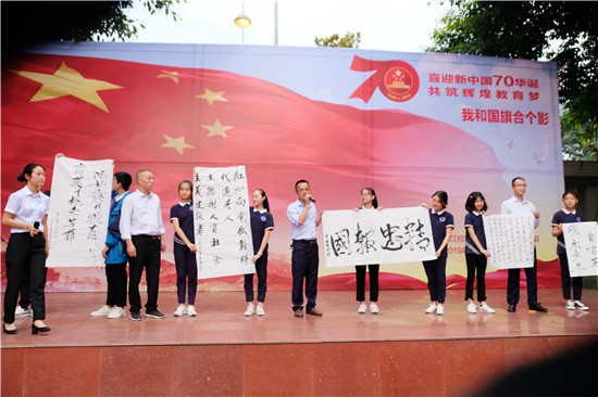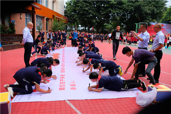 在舞臺前,小學(xué)部和初一年級學(xué)生簽下了自己的名字,許下“我是護(hù)旗手”的莊嚴(yán)承諾。初二年級20名學(xué)生代表分別在“我為祖國獻(xiàn)祝?!被顒又凶8W鎳拿魈煸絹碓矫篮谩T谏炫_右側(cè),初三年級34名學(xué)生代表參加了張貼省級行政區(qū)拼圖活動,通過此活動,將祖國的疆土牢記心中。活動現(xiàn)場,學(xué)校教職工通過開展書法比賽,為祖國母親送上節(jié)日的祝福。?