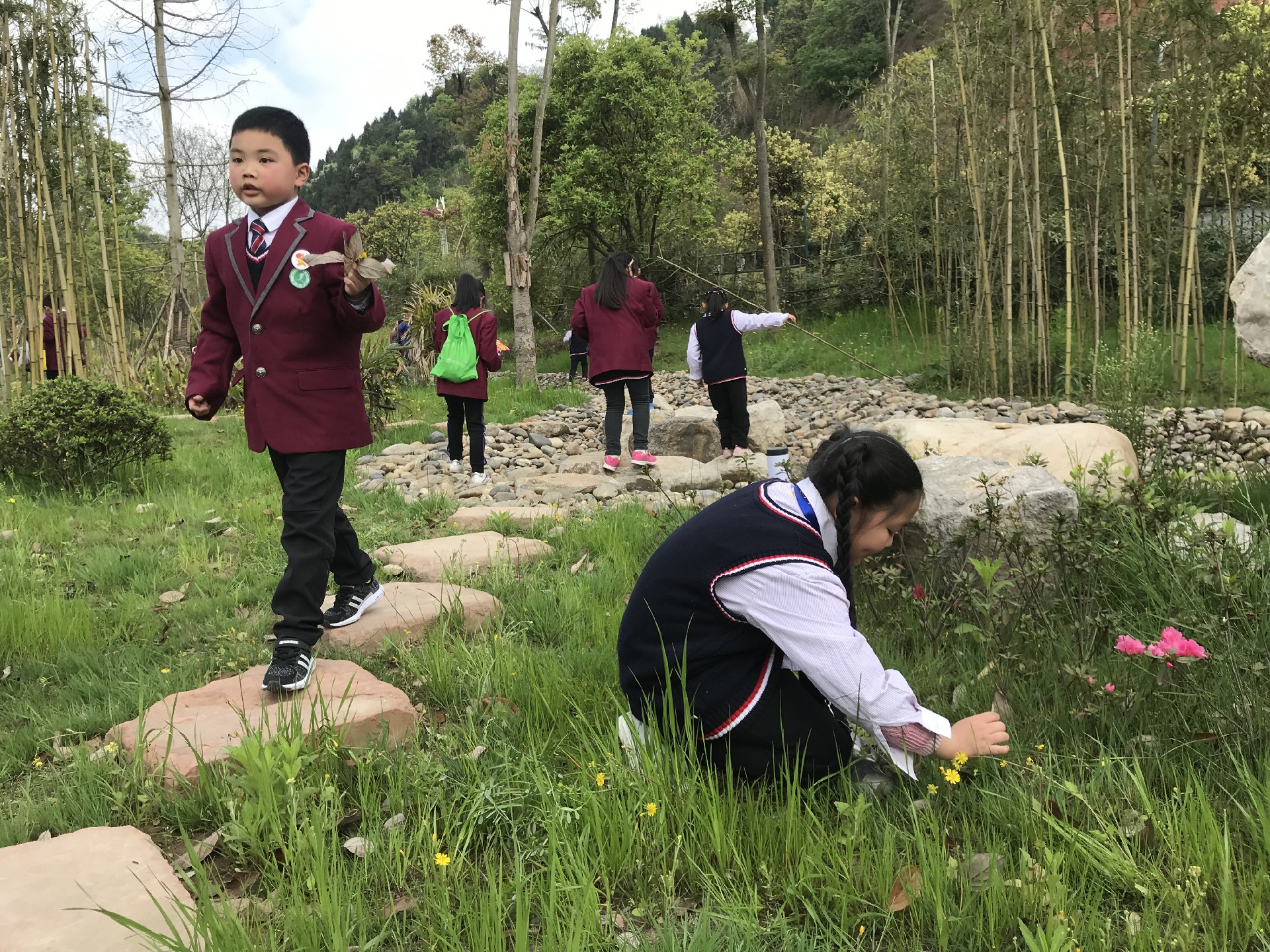 小學(xué)部、初一年級(jí)踏青悠悠臥龍湖,在親近自然的同時(shí),了解家鄉(xiāng)悠久的歷史文化,學(xué)生通過分組參觀、解說,樹葉粘貼畫等形式,將活動(dòng)實(shí)踐與語文、美術(shù)等學(xué)科有機(jī)融合。