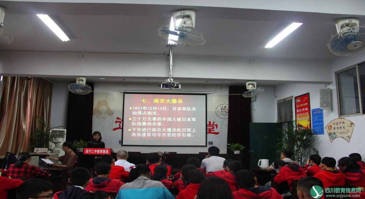 下午4點,在雄壯的國歌聲中,革命傳統(tǒng)教育報告會正式拉開帷幕。遂寧二中教育集團濱江校區(qū)副校長肖待春為學(xué)生作了熱情洋溢的致辭后,市關(guān)工委宣傳報告團報告員、遂寧市河?xùn)|幼兒園副園長周袁茜作了“牢記歷史 勿忘國恥 為實現(xiàn)中華民族偉大復(fù)興的中國夢而努力學(xué)習(xí)”的專題報告。她回顧了中華民族鴉片戰(zhàn)爭以來特別是抗日戰(zhàn)爭那段悲壯的歷史,展現(xiàn)了新中國建國以來特別是改革開放新時代取得的輝煌成就,鼓勵學(xué)生做愛學(xué)習(xí)、愛勞動、愛祖國的“三愛”青年。