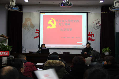 首先,學(xué)校黨支部書記、校長潘明英同志代表學(xué)校黨政作了重要講話,闡明本次競賽活動(dòng)的重要意義和目的要求。本次競賽大會(huì),分為集中學(xué)習(xí)、競賽、主旨發(fā)言等環(huán)節(jié)。賽后,學(xué)校黨支委員、副校長肖待春同志對本次競賽活動(dòng)作精彩點(diǎn)評(píng)。他對本次活動(dòng)予以充分肯定,說活動(dòng)搞得有意義,生動(dòng)活潑,檢驗(yàn)了支部黨員學(xué)習(xí)貫徹黨的十九大精神的成果。勉勵(lì)大家高舉中國特色社會(huì)主義偉大旗幟,不忘初心繼續(xù)前行,為實(shí)現(xiàn)遂寧二中教育集團(tuán)跨越式發(fā)展而奮斗!