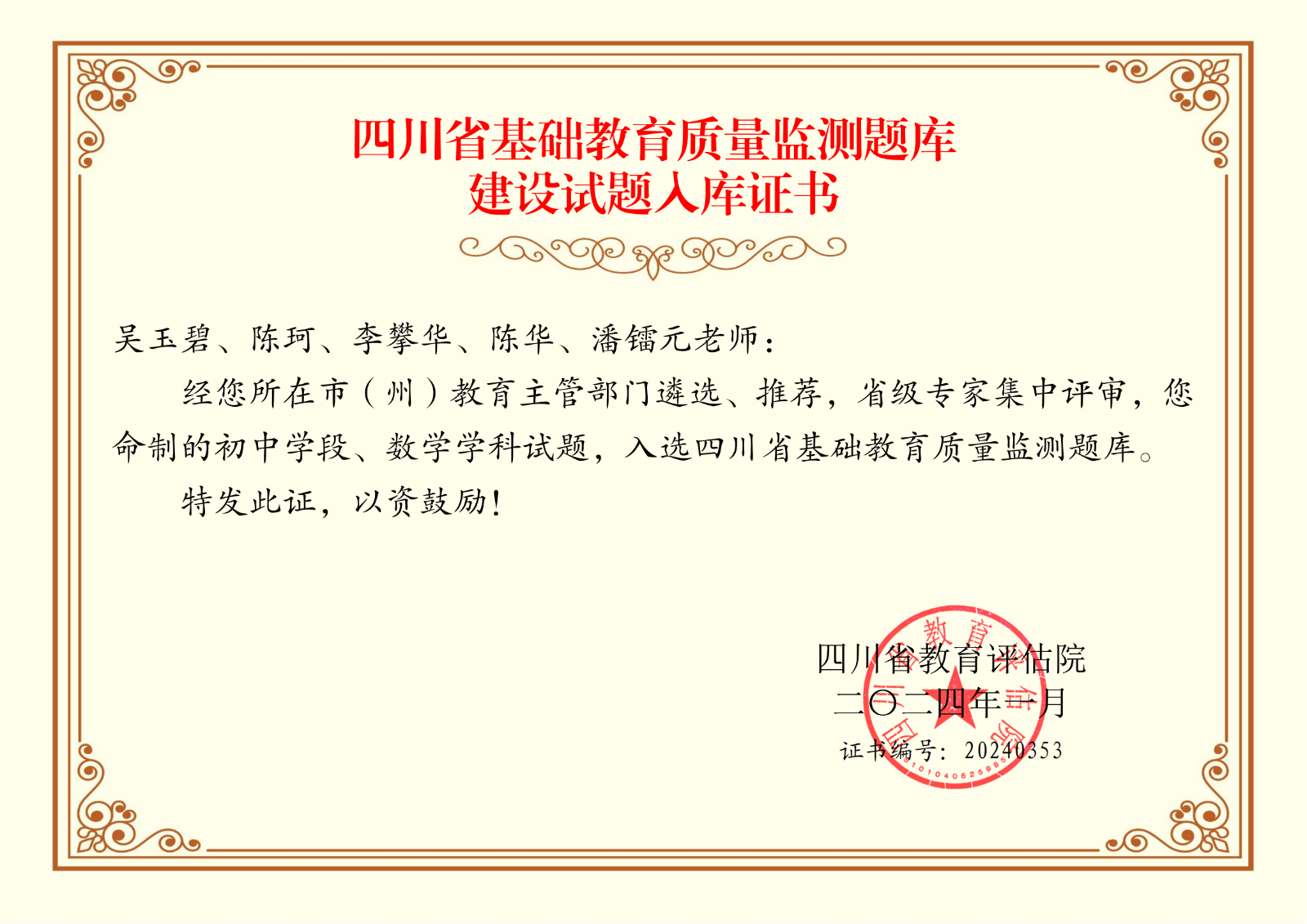 熱烈祝賀我校吳玉碧、陳珂、李攀華、陳華、潘鐳元老師命制的初中學(xué)段、數(shù)學(xué)學(xué)科試題,入選四川省基礎(chǔ)教育質(zhì)量監(jiān)測題庫。