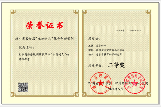 王強(qiáng)校長的案例《初中英語分級閱讀教學(xué)中“立德樹人”的實(shí)踐探究》獲二等獎
