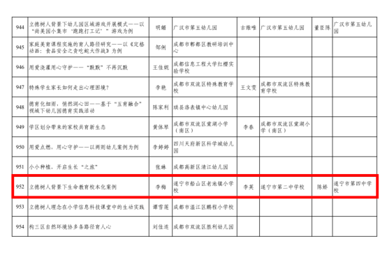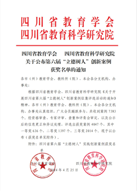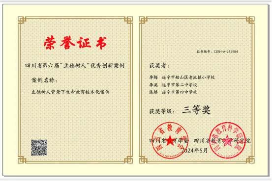 陳嬌副主任的案例《立德樹人背景下生命教育校本化案例》獲三等獎