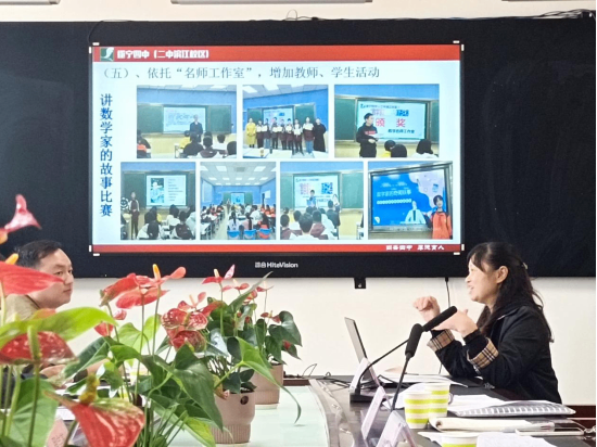 隨后,遂寧四中數(shù)學(xué)名師工作室領(lǐng)銜人吳玉碧老師帶來了學(xué)科專題講座《雙減背景下的初中數(shù)學(xué)學(xué)科建設(shè)的探索和思考》。吳老師結(jié)合自己多年帶領(lǐng)數(shù)學(xué)教研組的研究成果與實(shí)踐經(jīng)驗(yàn),就數(shù)學(xué)教育的理念、方法、技巧以及教學(xué)模式的探索等方面進(jìn)行了深入淺出的講解與分享。講座內(nèi)容既有理論高度,又貼近教學(xué)實(shí)際,為老師們奠定了堅(jiān)實(shí)的理論基礎(chǔ)。隨后遂寧四中副校長(zhǎng)李攀華帶來講座《以課程建設(shè)優(yōu)化學(xué)校教育生態(tài)》,帶領(lǐng)著華鎣市的同仁們認(rèn)識(shí)四中,了解四中,表達(dá)立德樹人,注重課程與課型改革相結(jié)合,不斷豐富課程資源,提高教學(xué)質(zhì)量的教學(xué)宗旨。