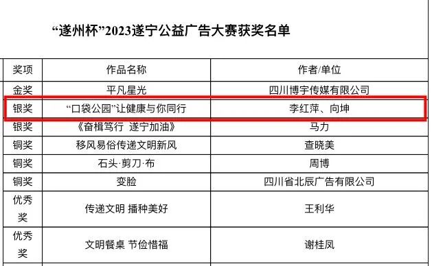 日前,由中共遂寧市委宣傳部、遂寧市市場(chǎng)監(jiān)督管理局聯(lián)合舉辦的“提振精氣神,建設(shè)成渝中部現(xiàn)代化建設(shè)示范市”為主題的“遂州杯”2023遂寧公益廣告大賽評(píng)選結(jié)果公布,由遂寧四中(二中濱江校區(qū))李紅萍、向昆老師報(bào)送的作品《口袋公園.讓健康與你同行》從973幅(組)參賽作品中脫穎而出,獲得社會(huì)組(平面)類別銀獎(jiǎng)。