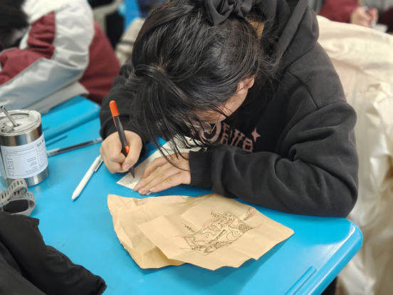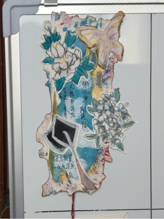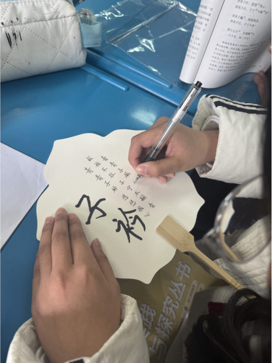 完成底色創(chuàng)作后,同學們再度提筆,在扇面上題詩作畫。有的以楷書謄抄《蒹葭》,致敬書法經(jīng)典;有的繪制寫意花鳥,展現(xiàn)“一花一世界”的哲思;更有創(chuàng)新者將流行文化與國風元素融合,讓傳統(tǒng)扇面煥發(fā)青春活力。