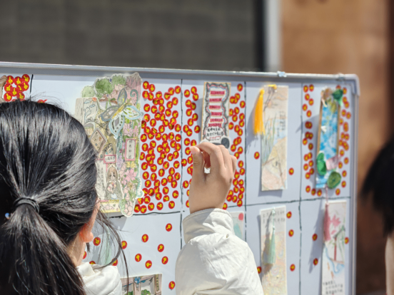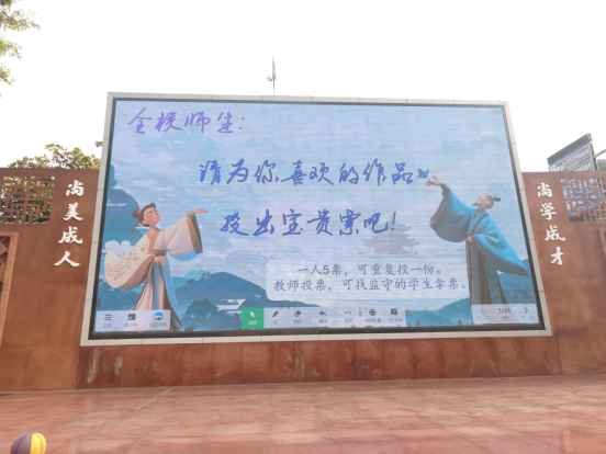 學校初二語文組聯(lián)合美術組教師們從“創(chuàng)意性、藝術性、文化內(nèi)涵"等維度對作品進行評選,最終選出50幅優(yōu)秀作品在全校進行,師生參與投票,熱鬧非凡。