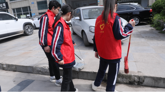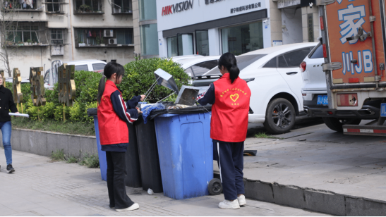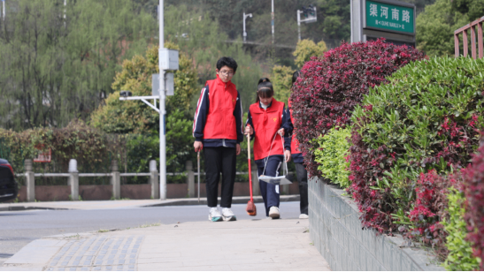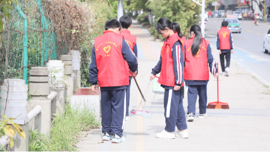 走出校園,服務社會。初一年級的志愿者們走進社區(qū),幫助社區(qū)清理垃圾,用熱情傳遞溫暖。