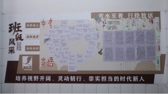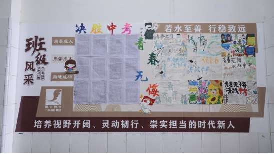九年級的“青春無悔 決戰(zhàn)中考”主題文化墻,則充滿了勵志氛圍。目標高中的圖片、激勵話語、中考倒計時牌以及同學們的學習計劃等內(nèi)容,時刻提醒著初三學子珍惜時光,努力拼搏。文化墻成為他們在備考路上相互鼓勵、奮勇向前的精神支柱,展現(xiàn)出他們?yōu)閴粝肴σ愿?、無悔青春的決心。
