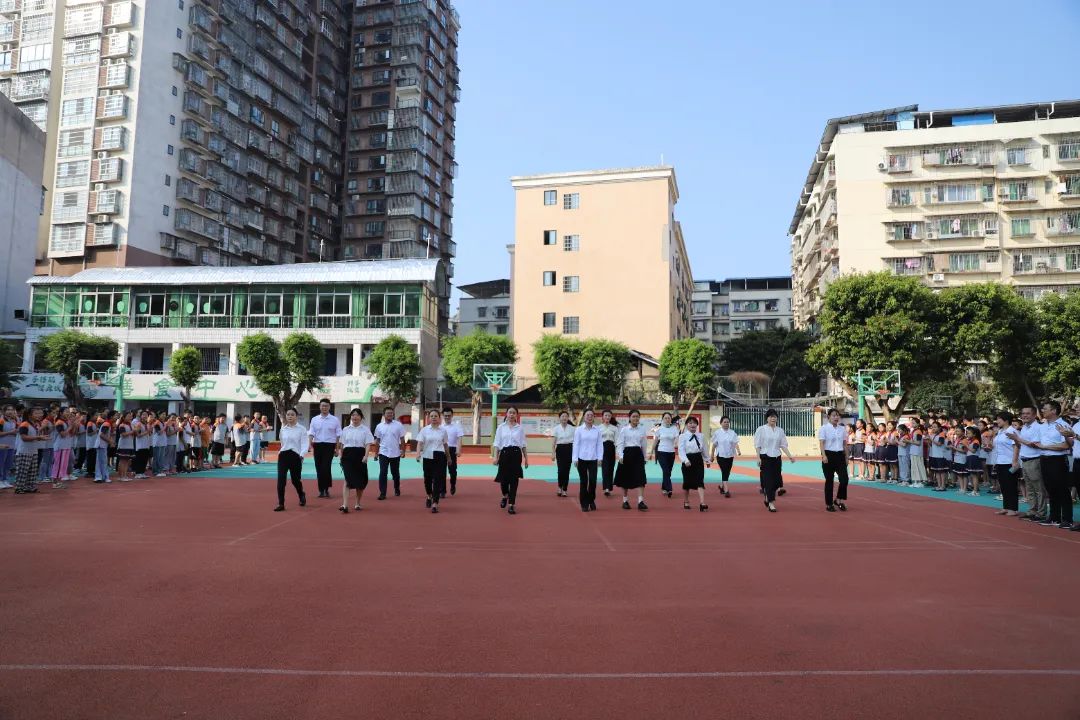 學校黨支部書記、校長王代彬帶領學校管理團隊登臺亮相。